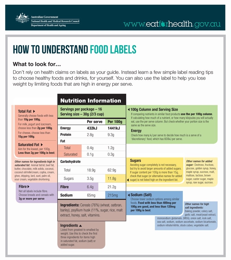 In Australia all food products come with a standardised nutritional information panel (NIP), that details the energy (kilojoules), protein, fat (saturated), carbohydrates, sugars, and sodium (salt) content of a food, both per 100g/100mL and per serve.